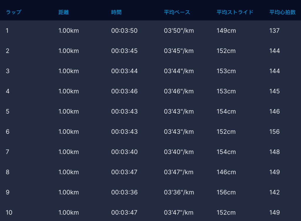 自分の見立てでは、前半4’00/kmくらいで進んで、後半3’50/km、ラスト3’40/kmのトータル3’50/kmくらいで落ち着くかなって感覚だった。