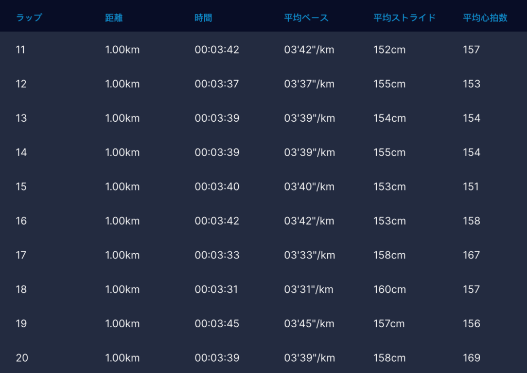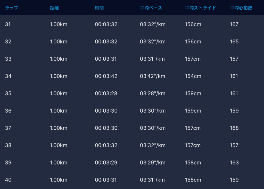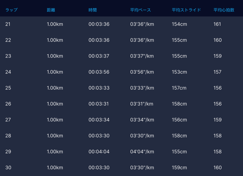 ここからは、ペースは気にせず心地いい(キツくないではなない)ペースで走る。この心地いいペースとは、私の中では『早く終わらせたい』というのもあってペースが上がる。