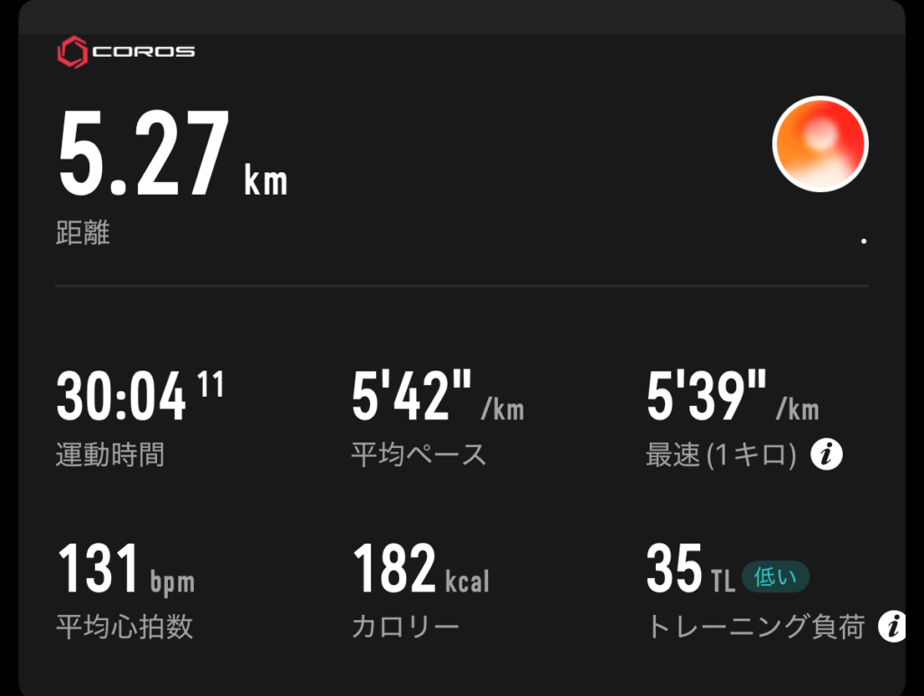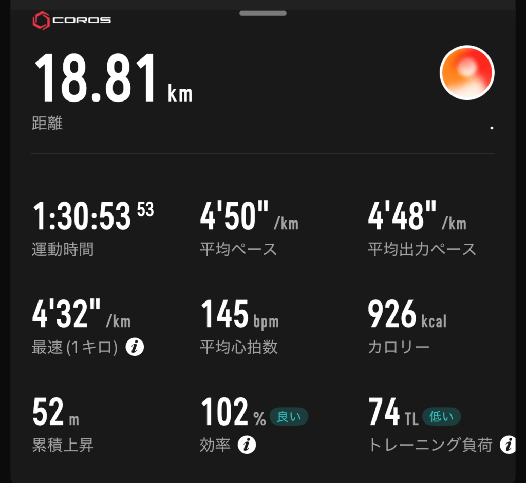 体が重かった印象。腰も落ちていて、いまいち。こういう時は、大体心拍数に出る。と思ったら、やはり心拍数高め。