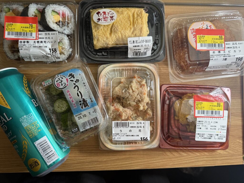 ドラッグストアのアオキだが、スーパーに特化したストアもある。これ全部アオキ。めちゃ安い!これだけ買っても1300円くらい。