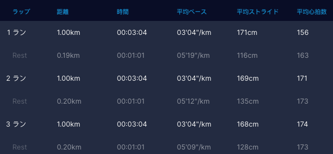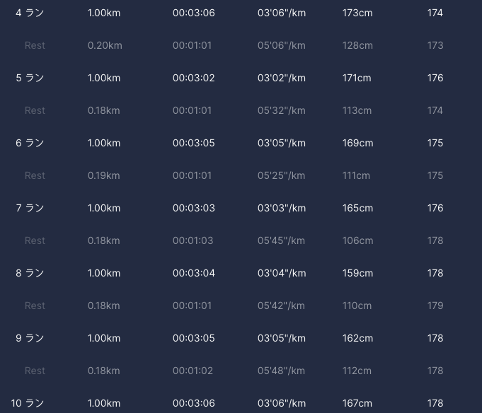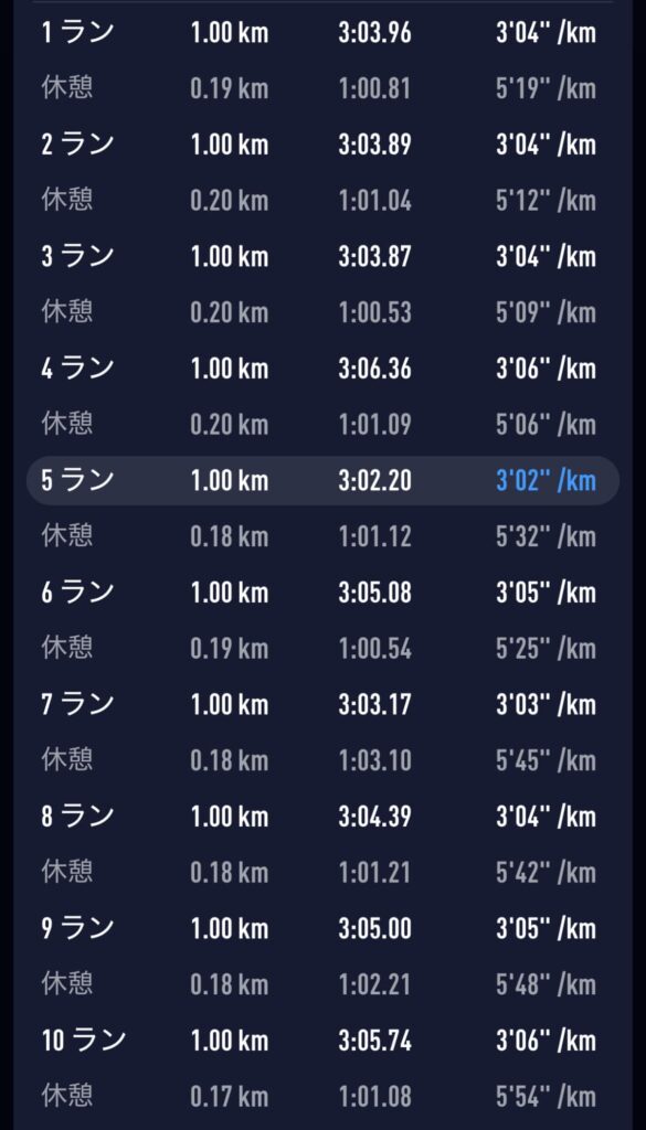 リカバリー90秒に延ばしたとしても、3’00/kmペースは行けそうになかったので、リカバリーはそのままで実施。