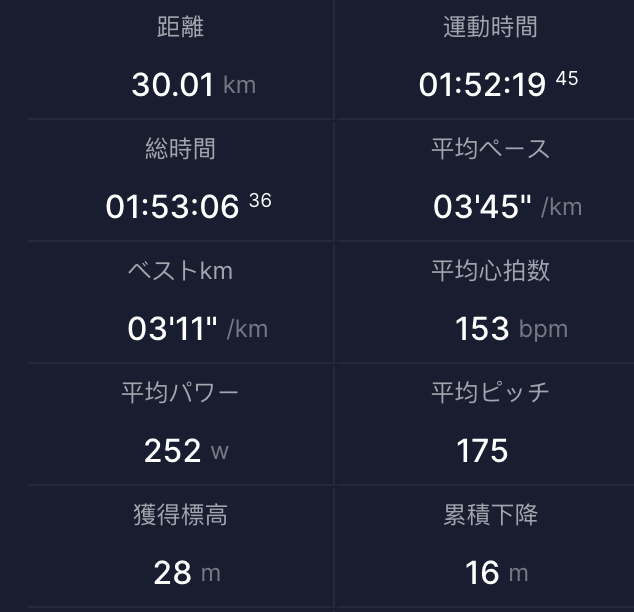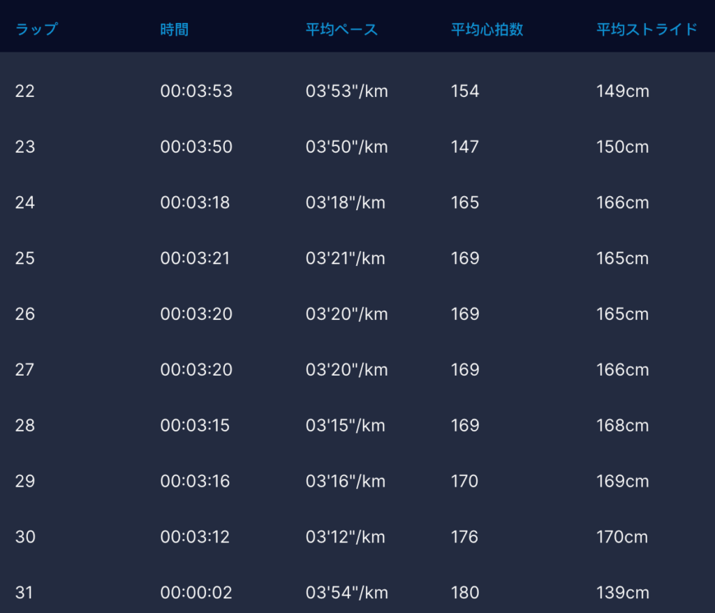2月15日 東京マラソンに向けて、距離を少し調整してロング走を実施 am 30km走 想定:23km (4’00/km) → last7km(Mペース) 結果 ラスト7km 前日の10kmTT苦手な朝トレ ということもあり、先週までと比較すると微妙な走りかな…まぁ、最低限は消化って感じだろうか 前半は動きは良かったが…午後から予定があるということもあり、集中力があまりなかったかなって感じだった。