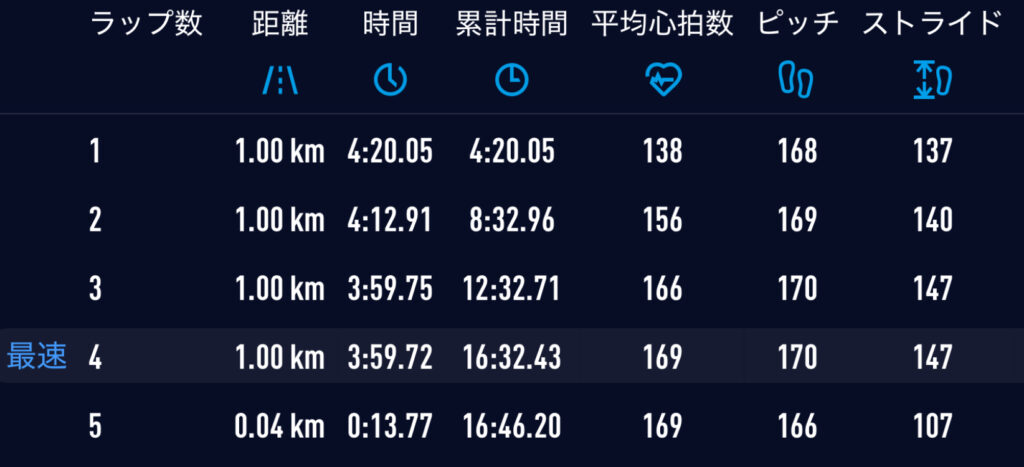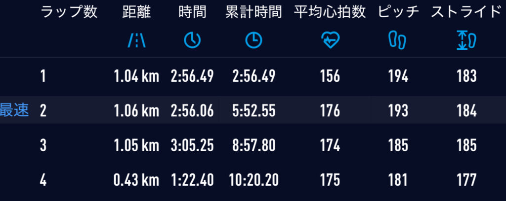 目標は14分39秒。1kmラップ2分55秒(400m70秒)