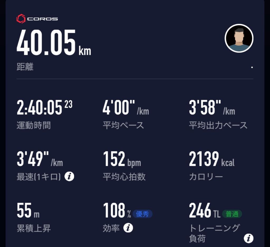 感覚的には、トータル4’10/kmくらいかなって感じ。4’00/kmなら上出来!